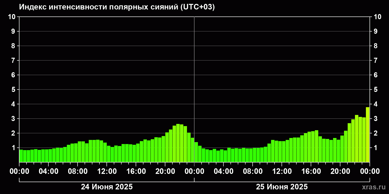 Изменения индекса интенсивности полярных сияний с 2025-06-24 по 2025-06-25 по местному времени