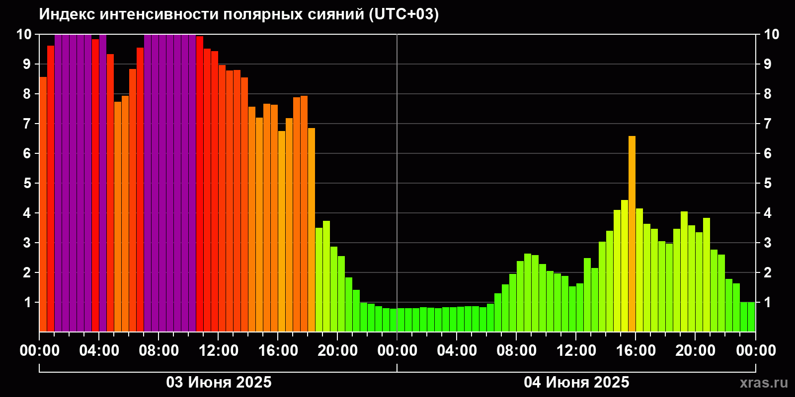 Изменения индекса интенсивности полярных сияний с 2025-06-03 по 2025-06-04 по местному времени