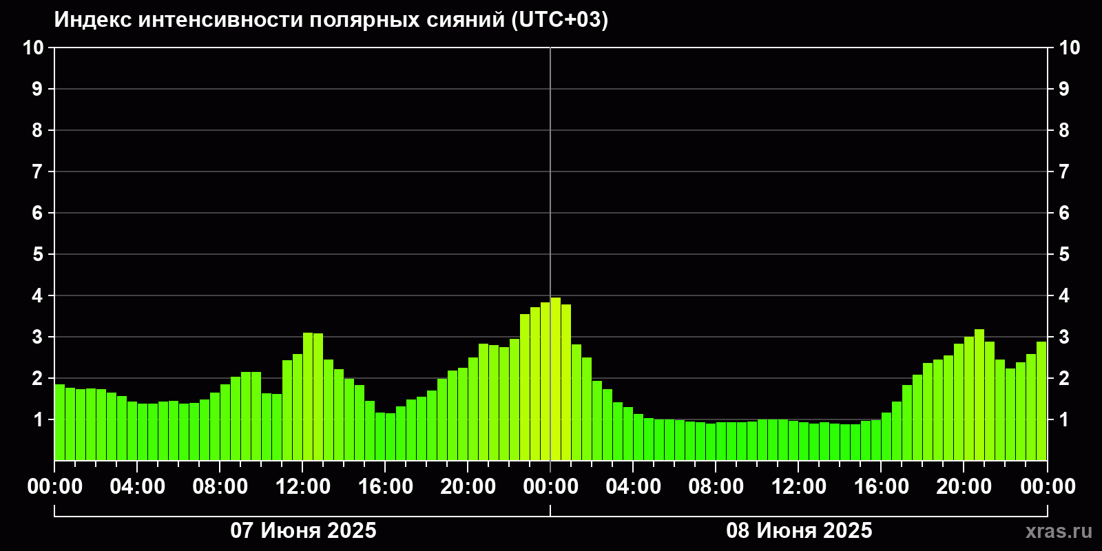Изменения индекса интенсивности полярных сияний с 2025-06-07 по 2025-06-08 по местному времени