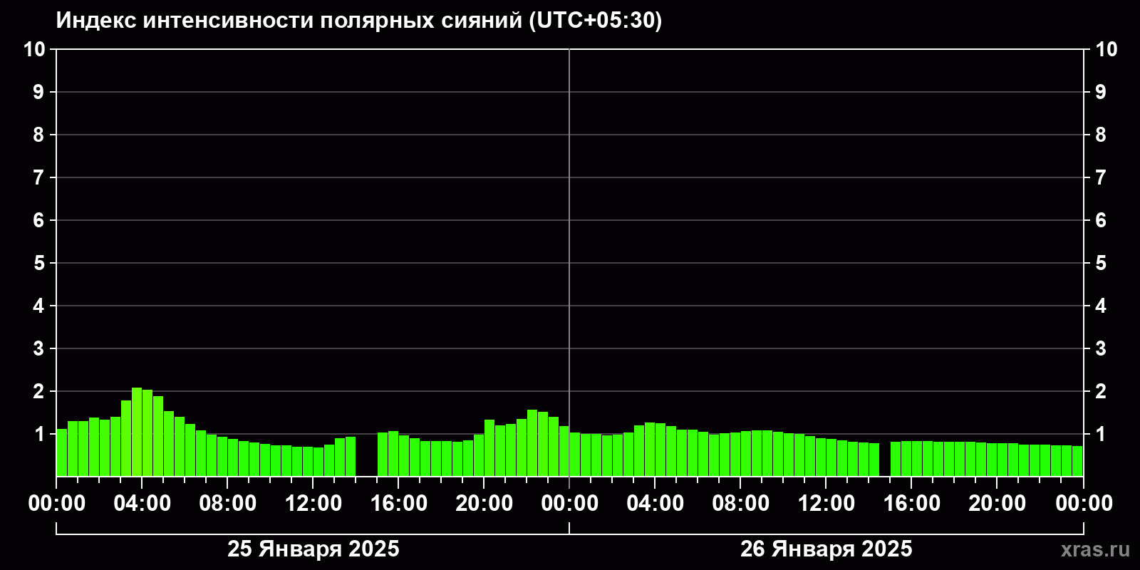 Изменения индекса интенсивности полярных сияний с 2025-01-25 по 2025-01-26 по местному времени