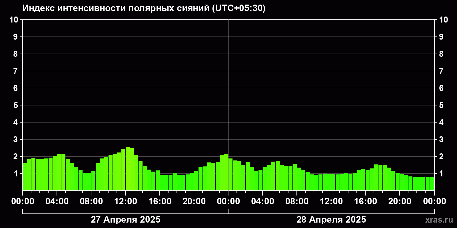 Изменения индекса интенсивности полярных сияний с 2025-04-27 по 2025-04-28 по местному времени