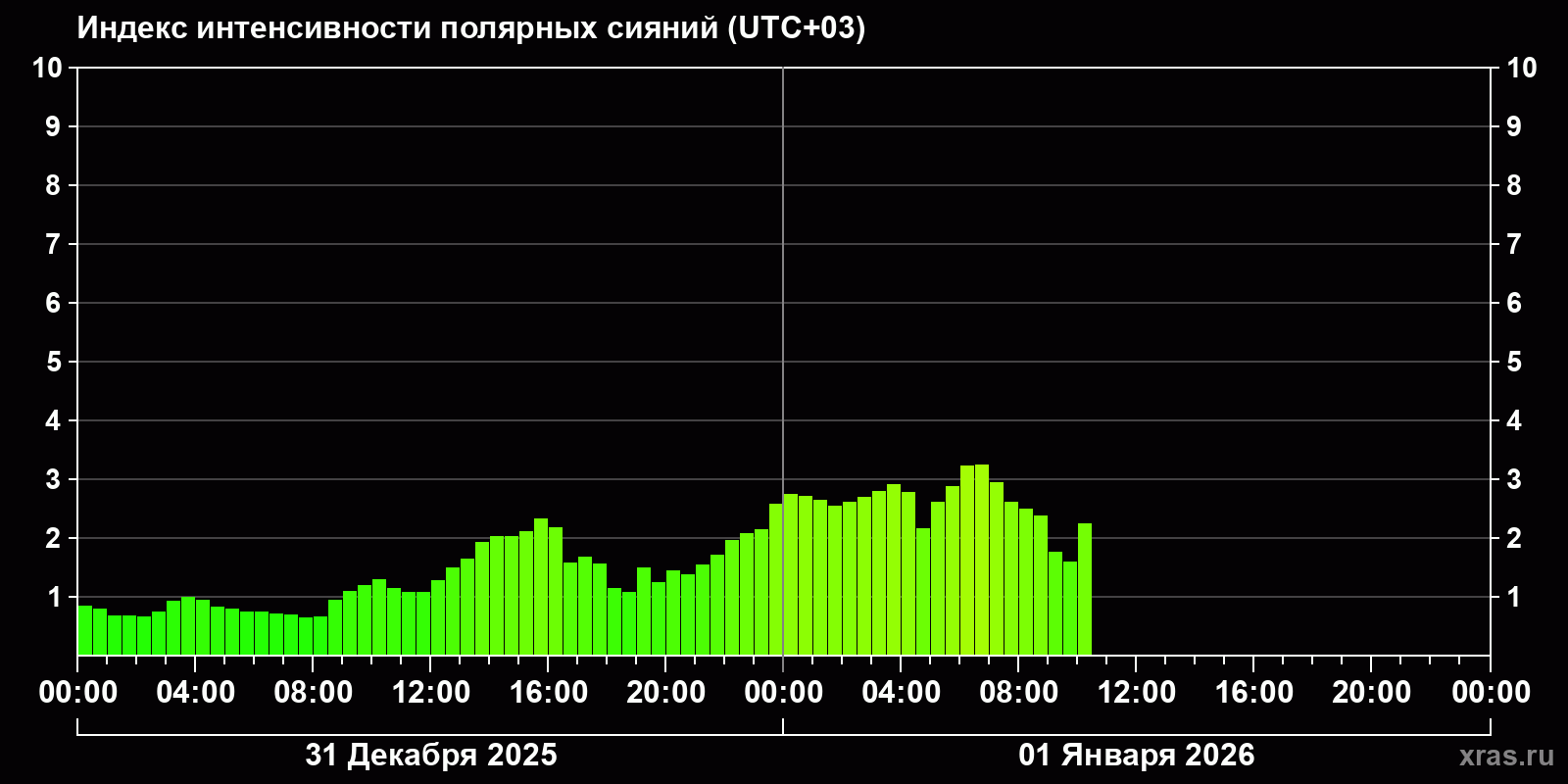 Изменения индекса интенсивности полярных сияний с 2025-12-31 по 2026-01-01 по местному времени