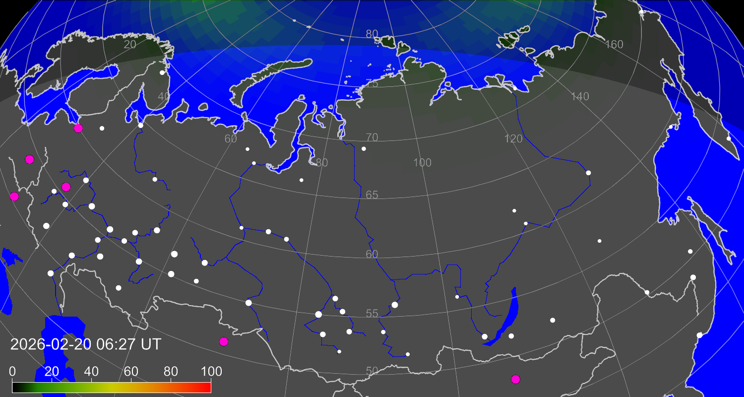Индекс интенсивности полярных сияний и теоретически возможная широта наблюдений для ночного времени в восточном полушарии