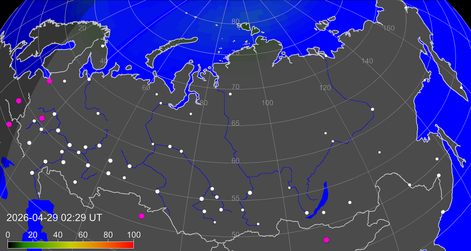 Индекс интенсивности полярных сияний и теоретически возможная широта наблюдений для ночного времени в восточном полушарии