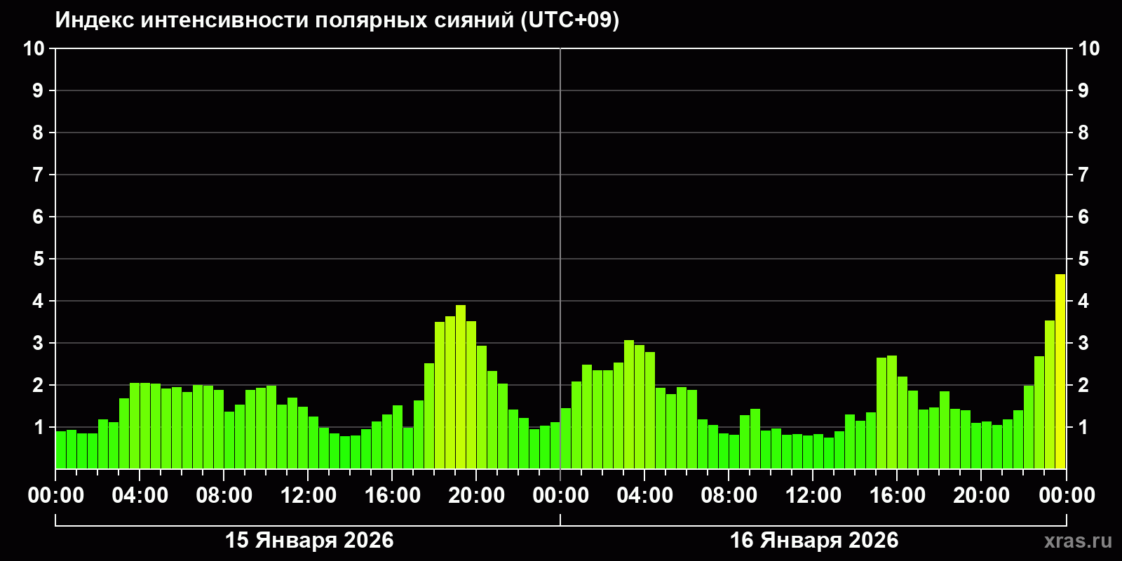 Изменения индекса интенсивности полярных сияний с 2026-01-15 по 2026-01-16 по местному времени