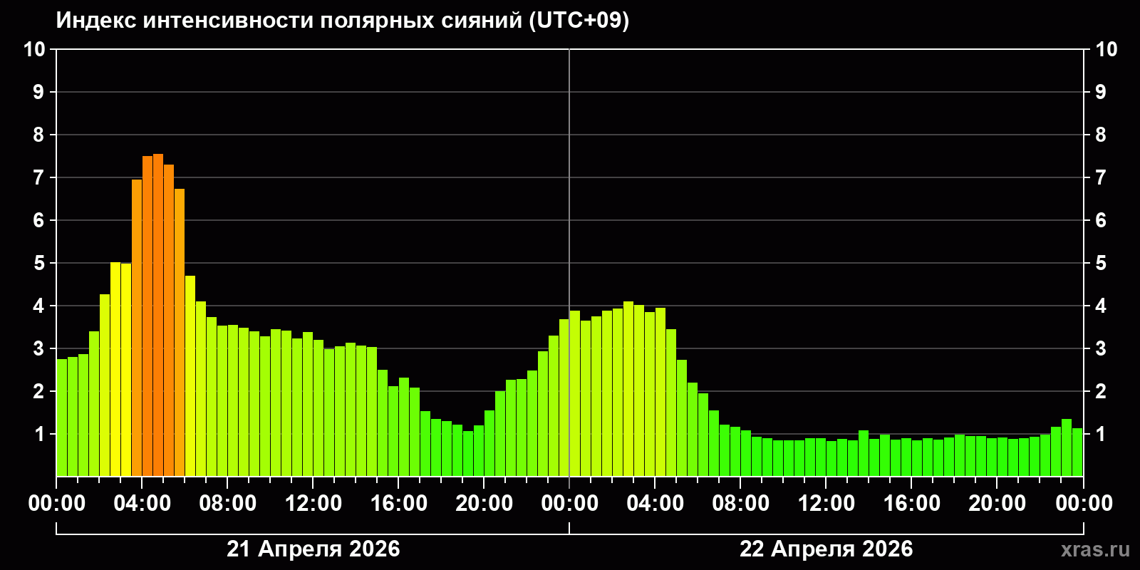 Изменения индекса интенсивности полярных сияний с 2026-04-21 по 2026-04-22 по местному времени