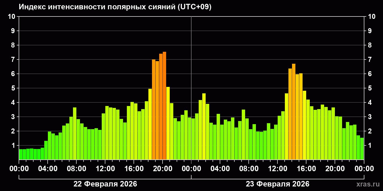 Изменения индекса интенсивности полярных сияний с 2026-02-22 по 2026-02-23 по местному времени
