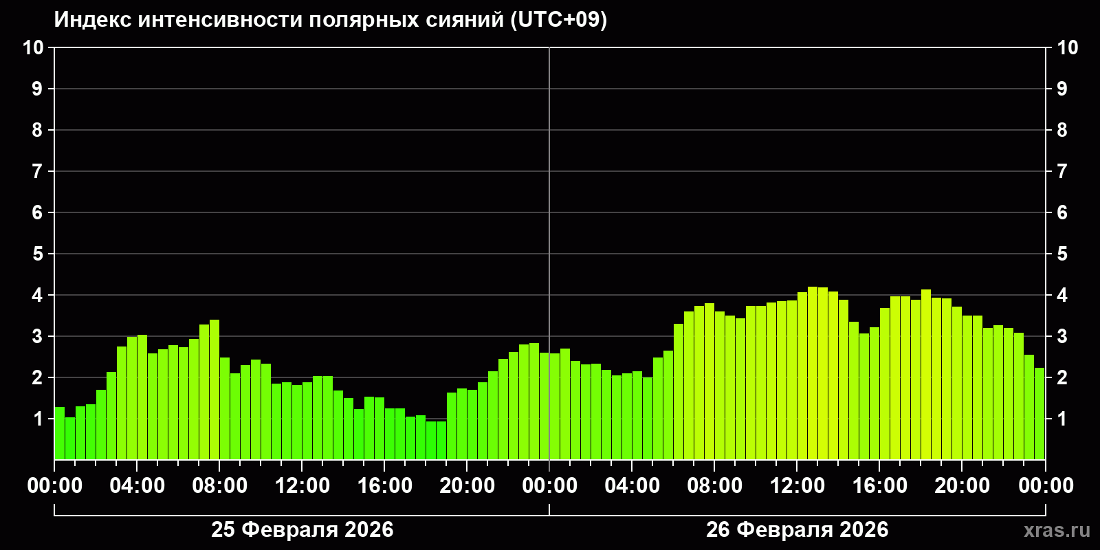 Изменения индекса интенсивности полярных сияний с 2026-02-25 по 2026-02-26 по местному времени