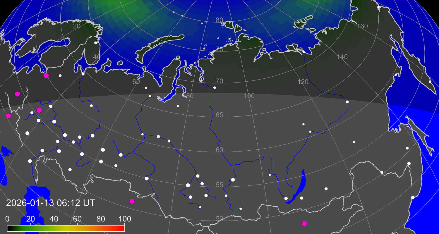 Изменения и часовой прогноз индекса интенсивности полярных сияний с 2026-01-13 по 2026-01-14