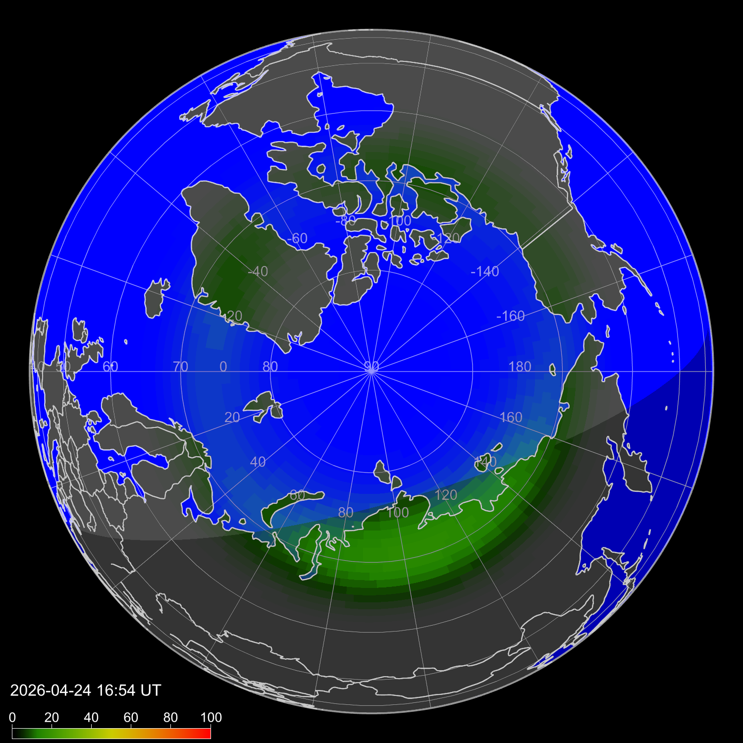Индекс интенсивности полярных сияний и теоретически возможная широта наблюдений для ночного времени в западном полушарии
