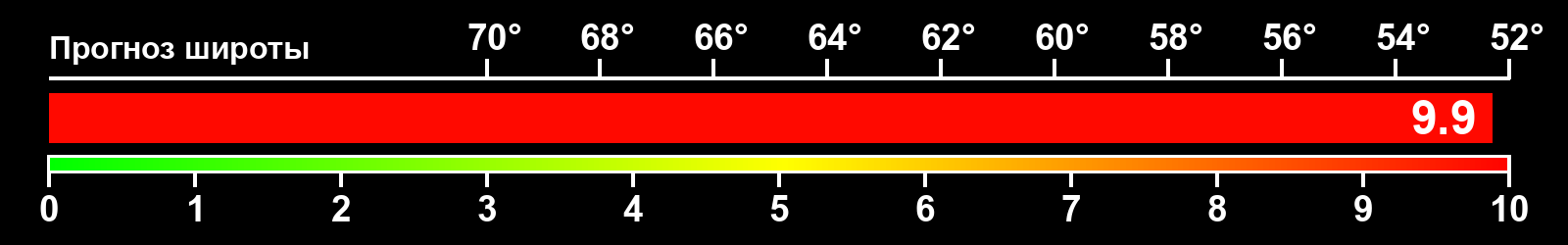 Индекс интенсивности полярных сияний и теоретически возможная широта наблюдений для ночного времени в восточном полушарии по состоянию на 2026-01-10 23:48 (конец дня) по местному времени