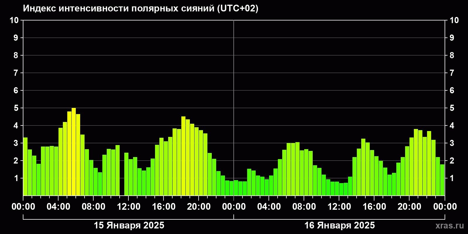 Изменения индекса интенсивности полярных сияний с 2025-01-15 по 2025-01-16 по местному времени