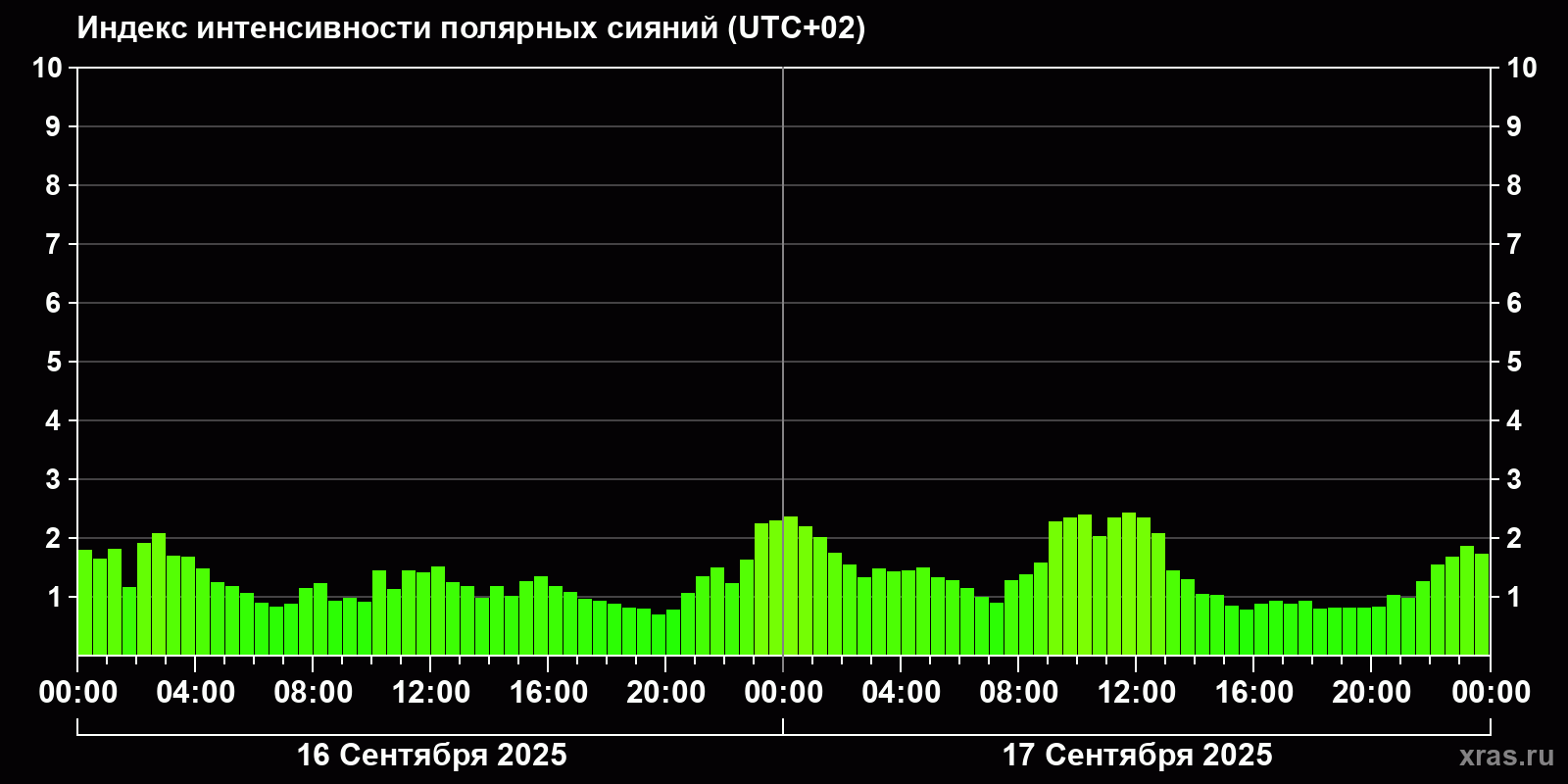 Изменения индекса интенсивности полярных сияний с 2025-09-16 по 2025-09-17 по местному времени
