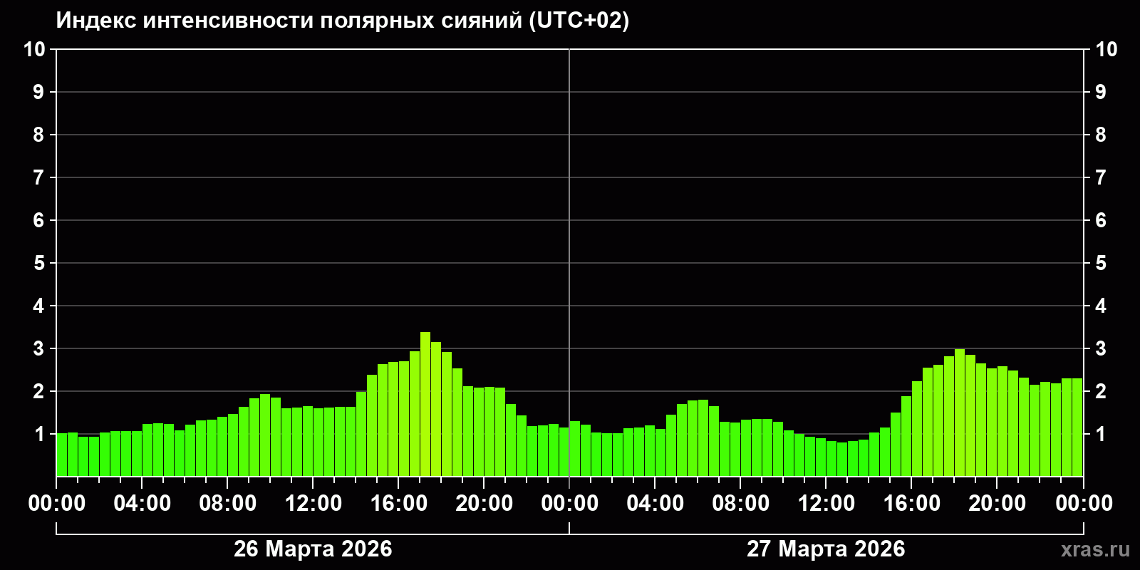 Изменения индекса интенсивности полярных сияний с 2026-03-26 по 2026-03-27 по местному времени