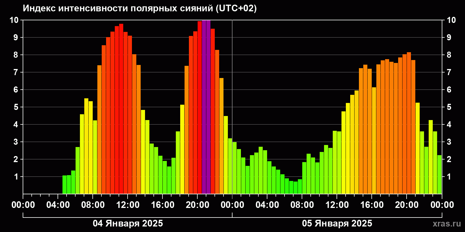 Изменения индекса интенсивности полярных сияний с 2025-01-04 по 2025-01-05 по местному времени