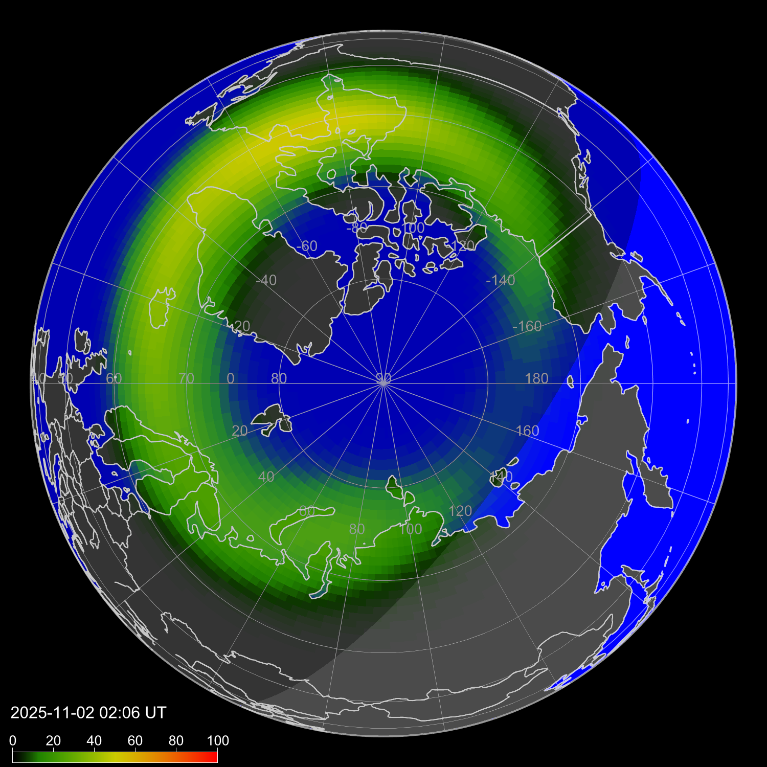 Изменения и часовой прогноз индекса интенсивности полярных сияний с 2025-11-01 по 2025-11-02
