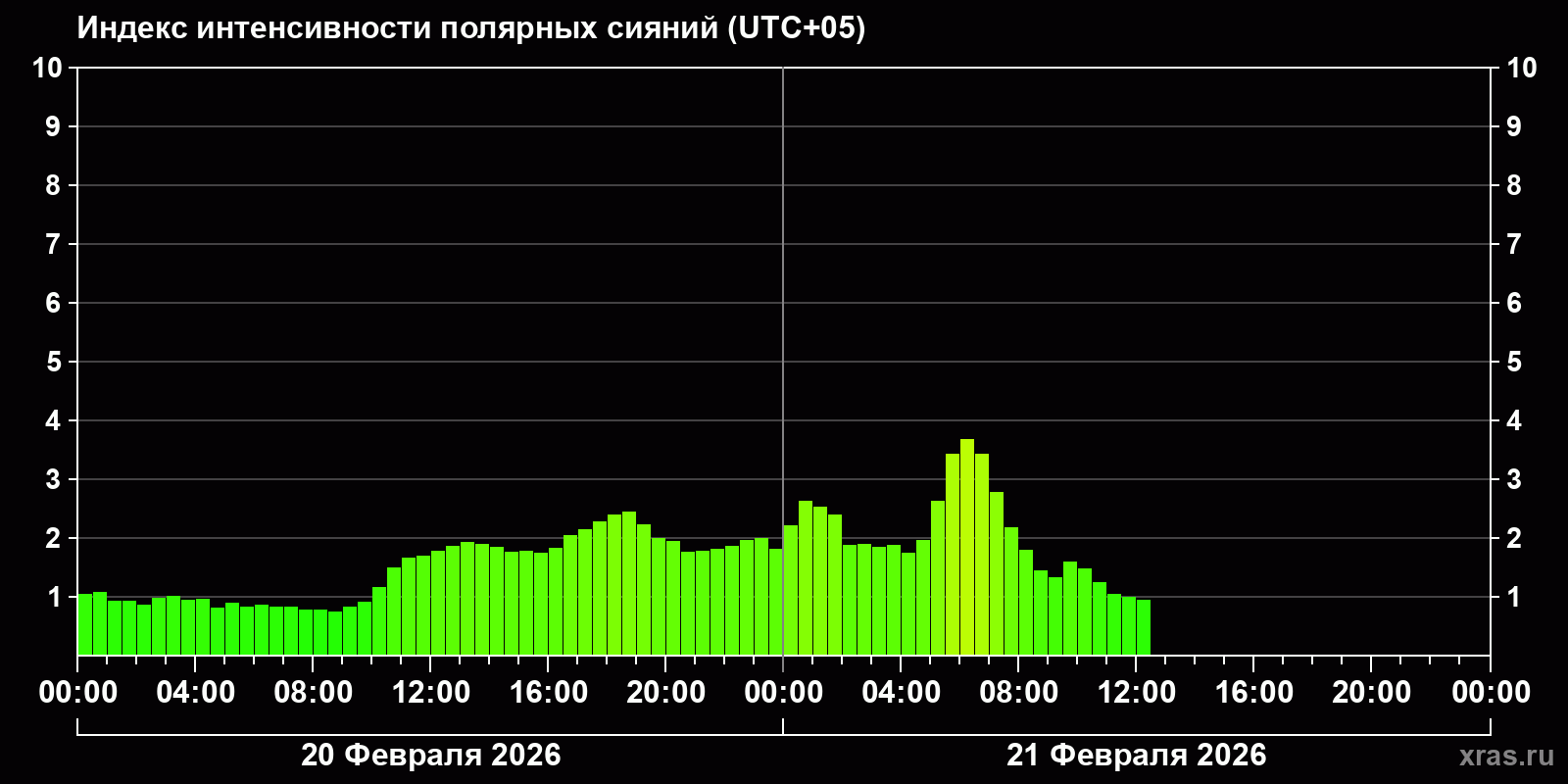Изменения индекса интенсивности полярных сияний с 2026-02-20 по 2026-02-21 по местному времени