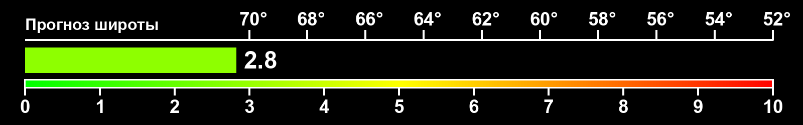 Индекс интенсивности полярных сияний и теоретически возможная широта наблюдений для ночного времени в восточном полушарии по состоянию на 2026-03-08 23:50 (конец дня) по местному времени