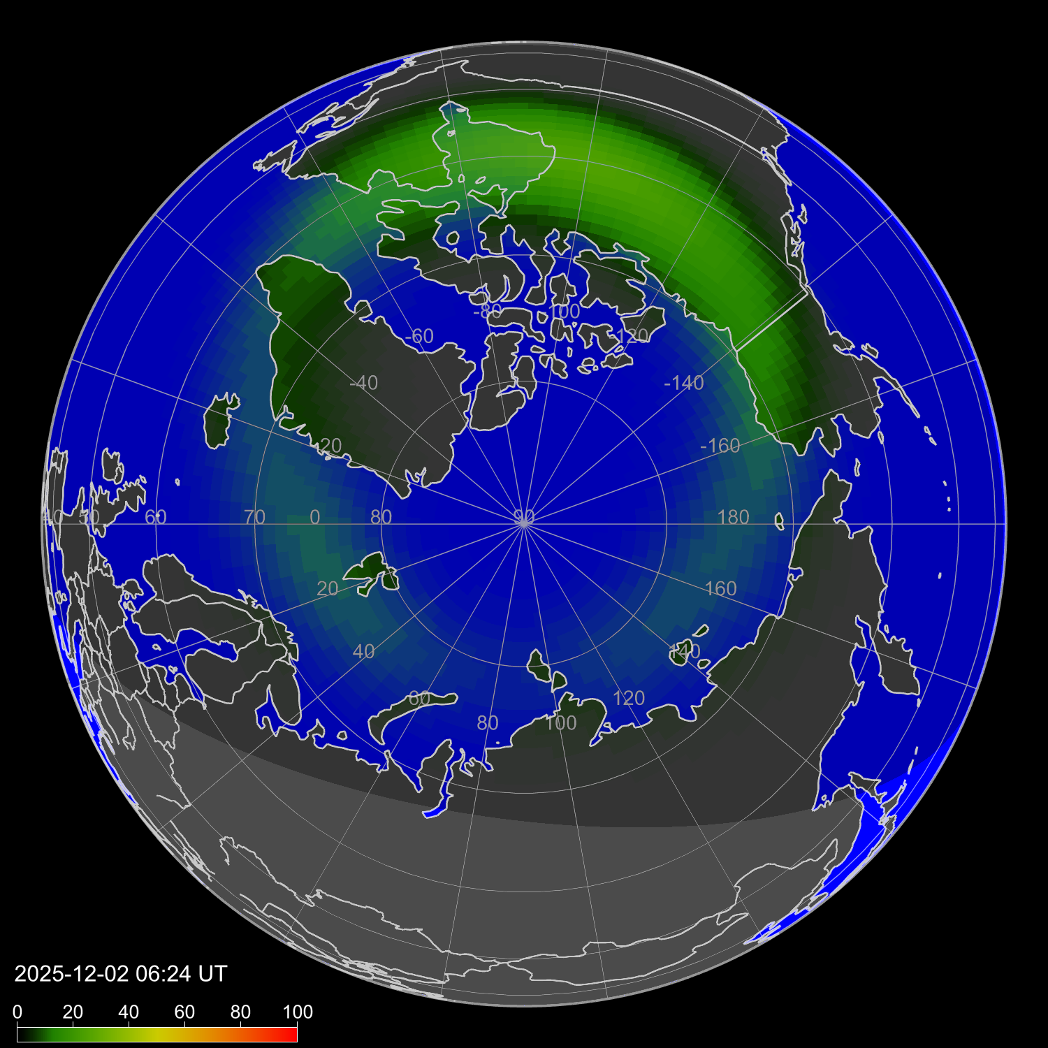 Изменения и часовой прогноз индекса интенсивности полярных сияний с 2025-11-30 по 2025-12-01