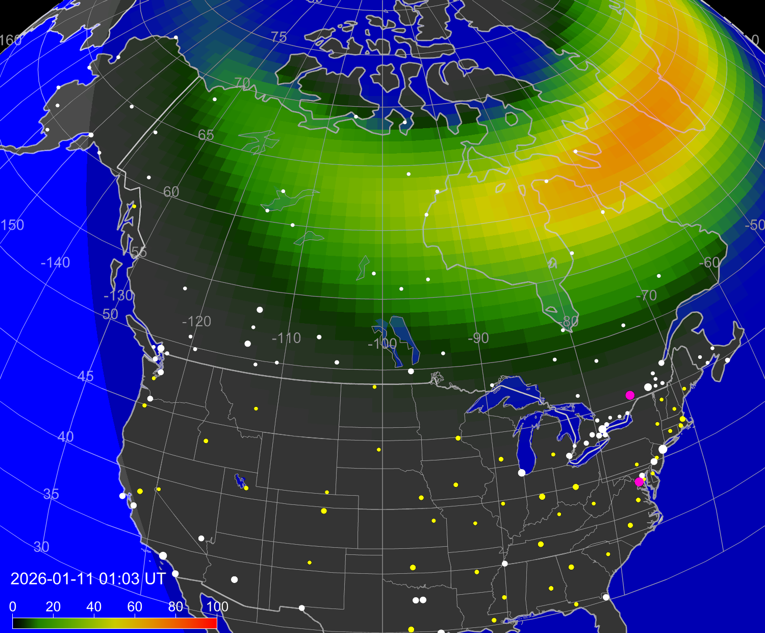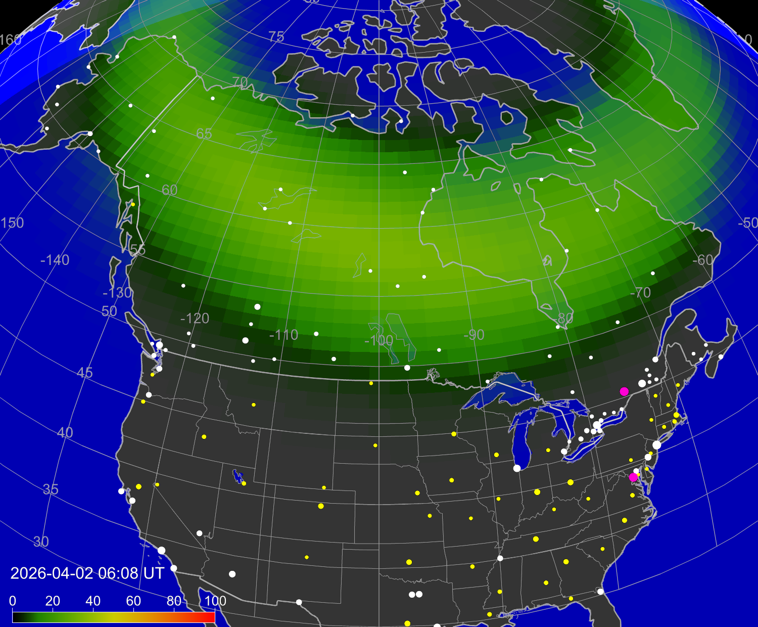 Вероятность полярных сияний в городах США