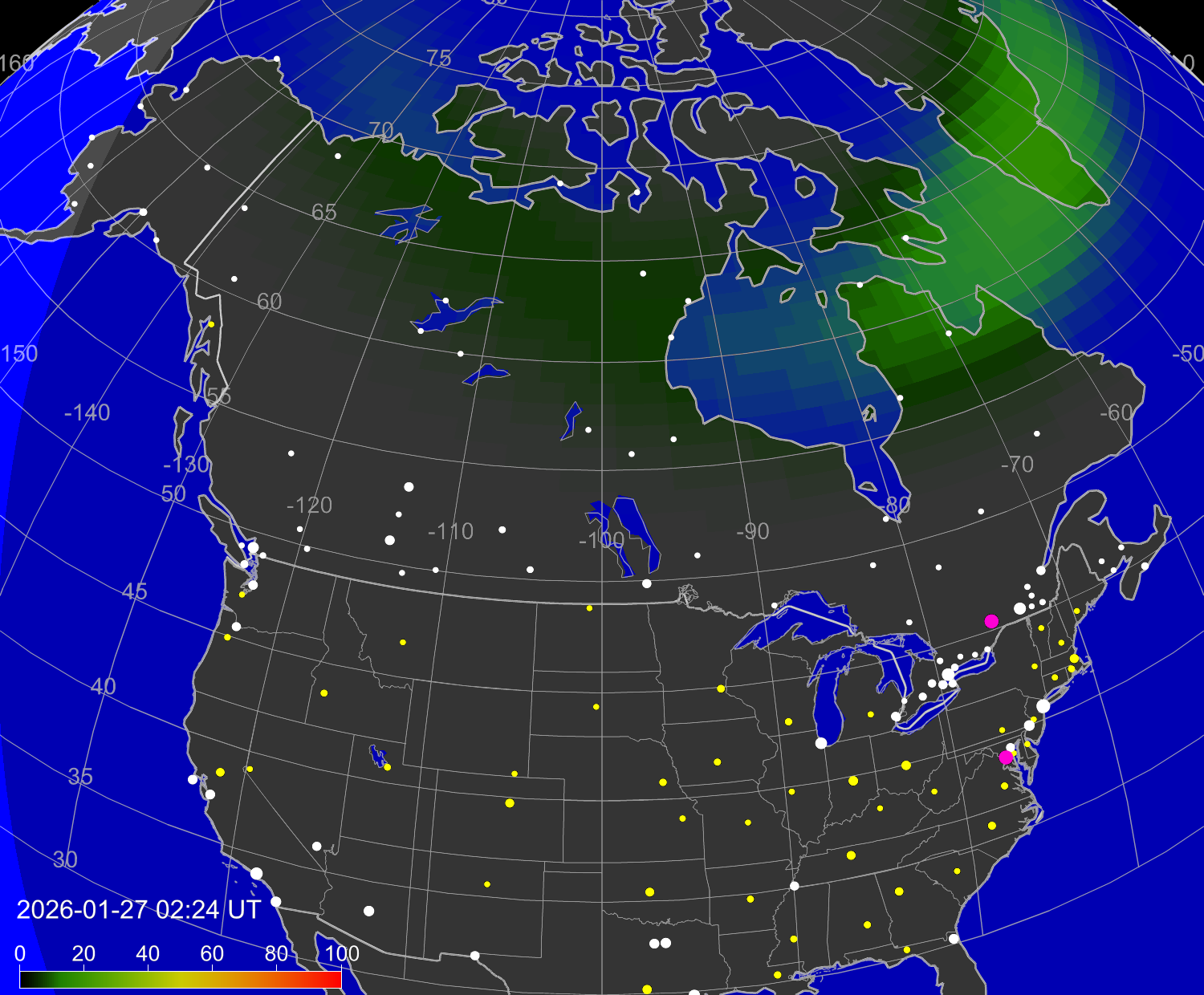 Индекс интенсивности полярных сияний и теоретически возможная широта наблюдений для ночного времени в западном полушарии