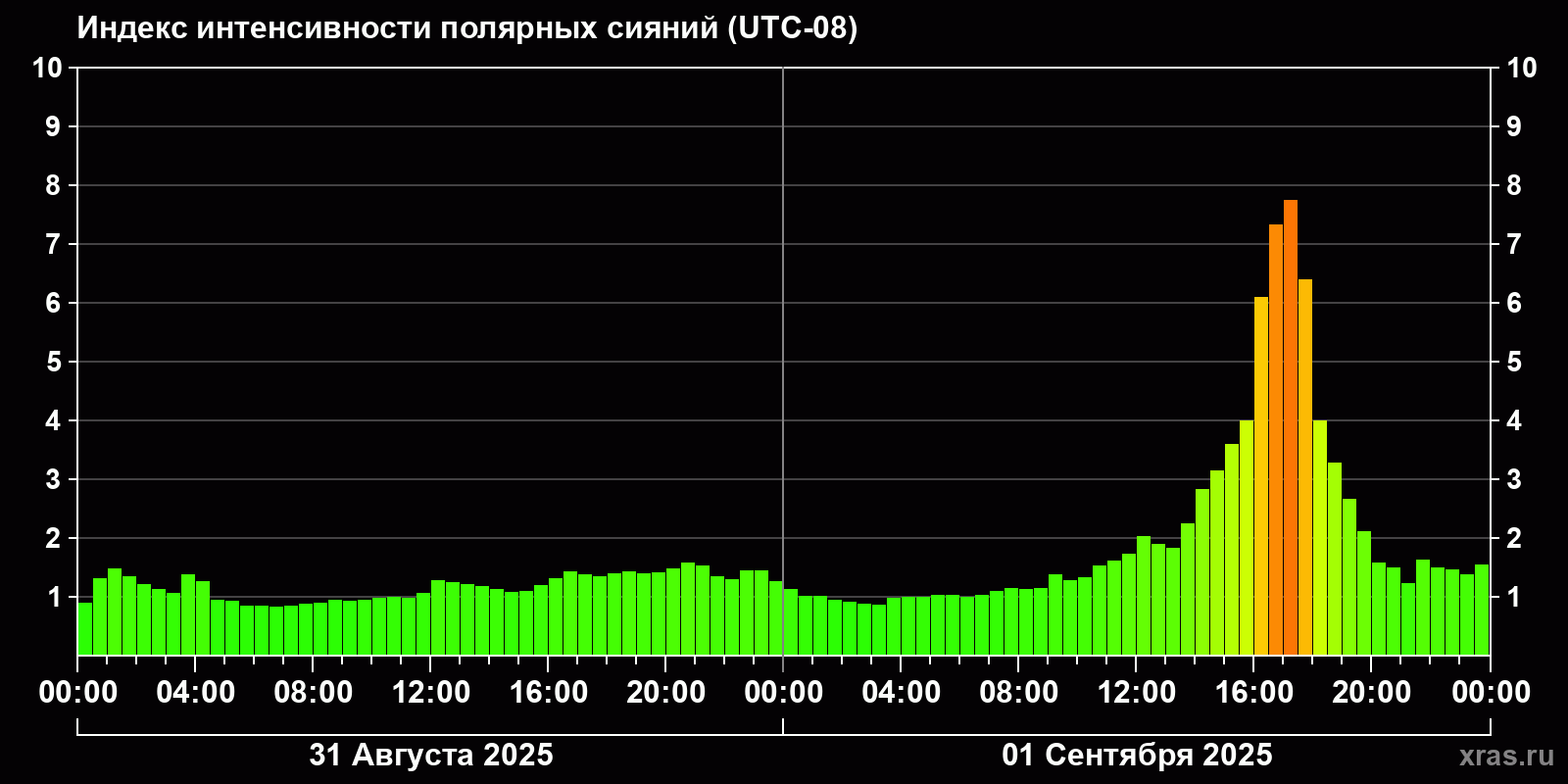 Изменения индекса интенсивности полярных сияний с 2025-08-31 по 2025-09-01 по местному времени