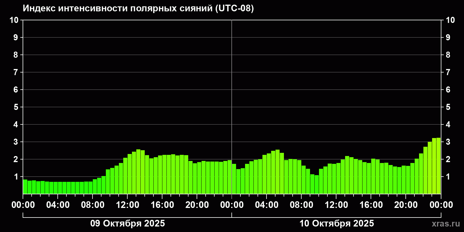 Изменения индекса интенсивности полярных сияний с 2025-10-09 по 2025-10-10 по местному времени