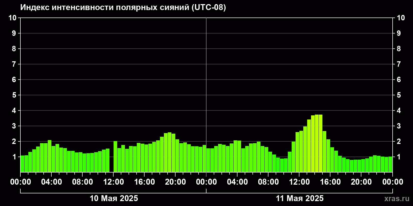 Изменения индекса интенсивности полярных сияний с 2025-05-10 по 2025-05-11 по местному времени