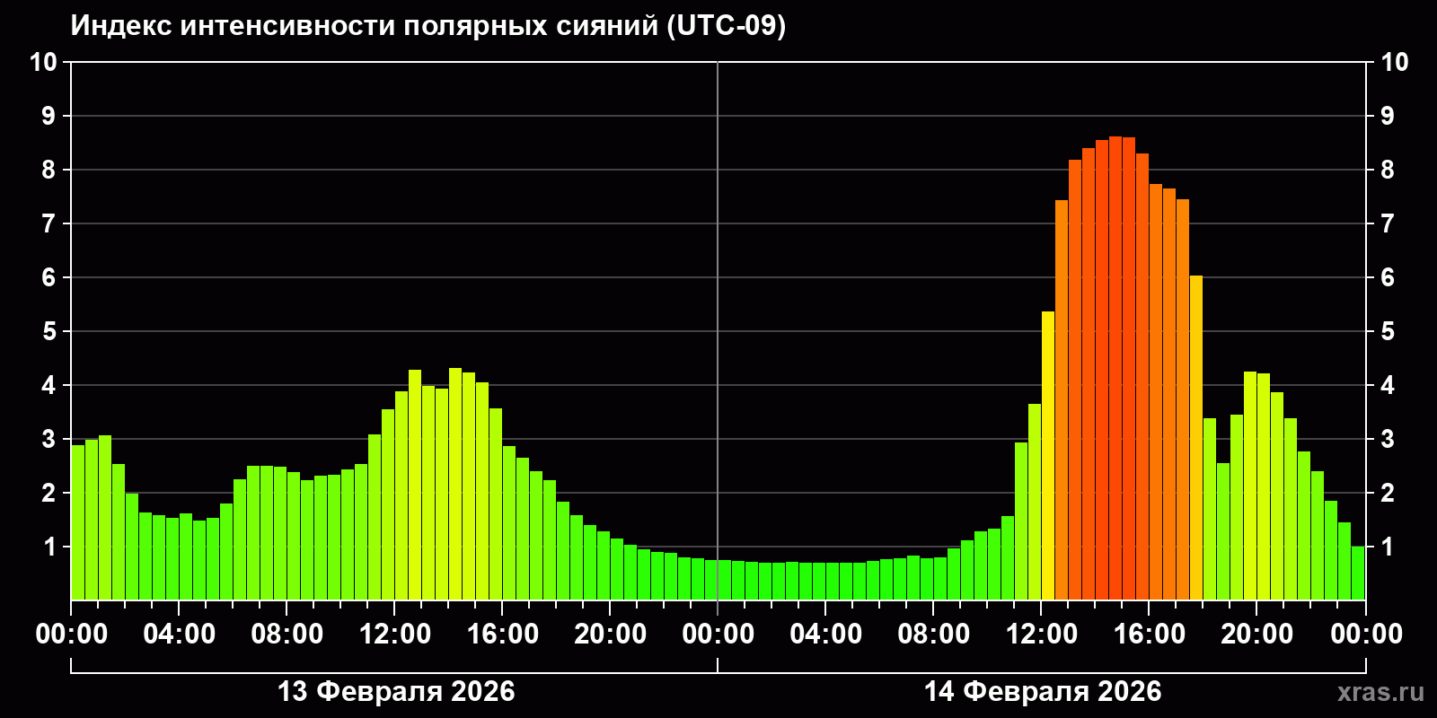 Изменения индекса интенсивности полярных сияний с 2026-02-13 по 2026-02-14 по местному времени