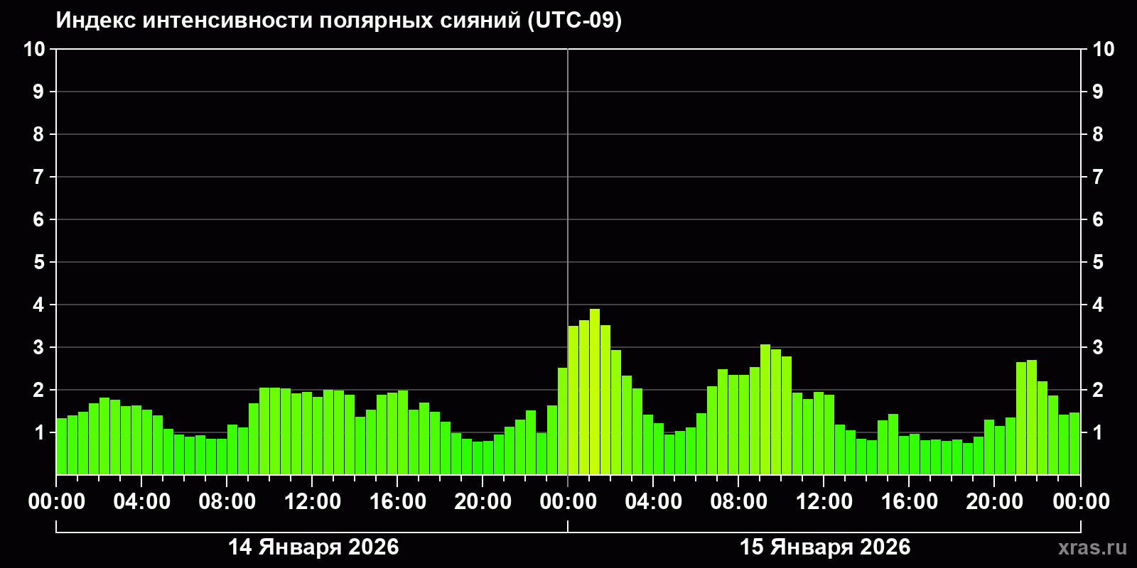Изменения индекса интенсивности полярных сияний с 2026-01-14 по 2026-01-15 по местному времени