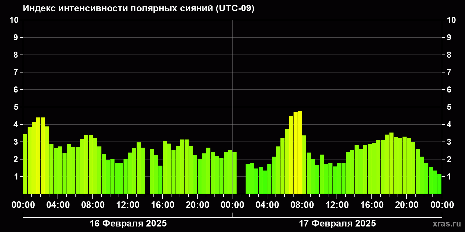 Изменения индекса интенсивности полярных сияний с 2025-02-16 по 2025-02-17 по местному времени