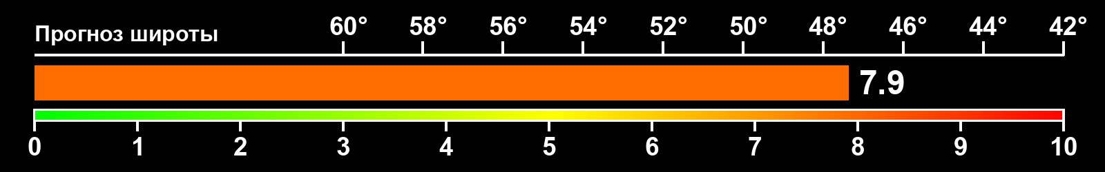 Индекс интенсивности полярных сияний и теоретически возможная широта наблюдений для ночного времени в западном полушарии по состоянию на 2026-04-17 23:55 (конец дня) по местному времени