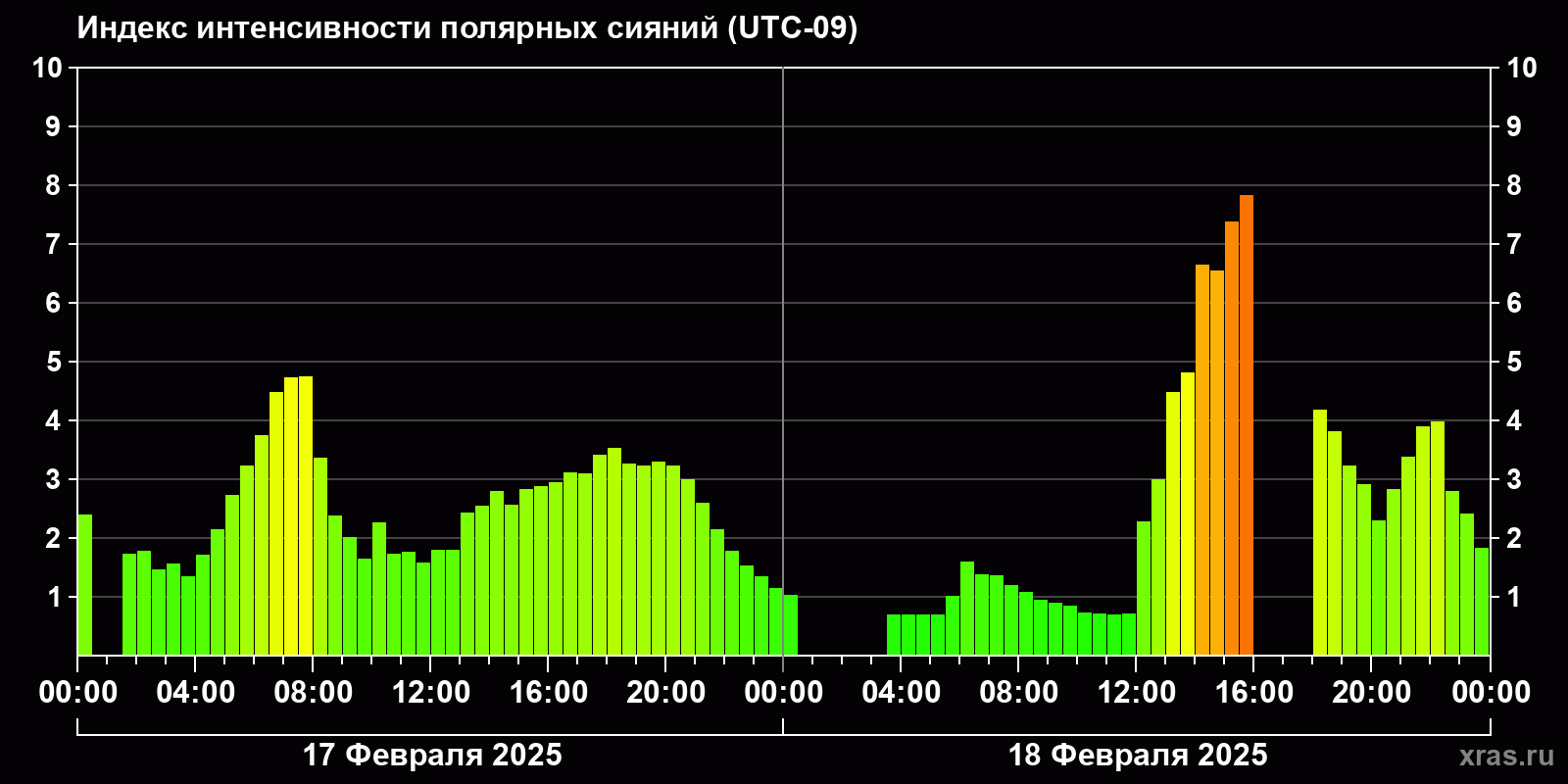 Изменения индекса интенсивности полярных сияний с 2025-02-17 по 2025-02-18 по местному времени