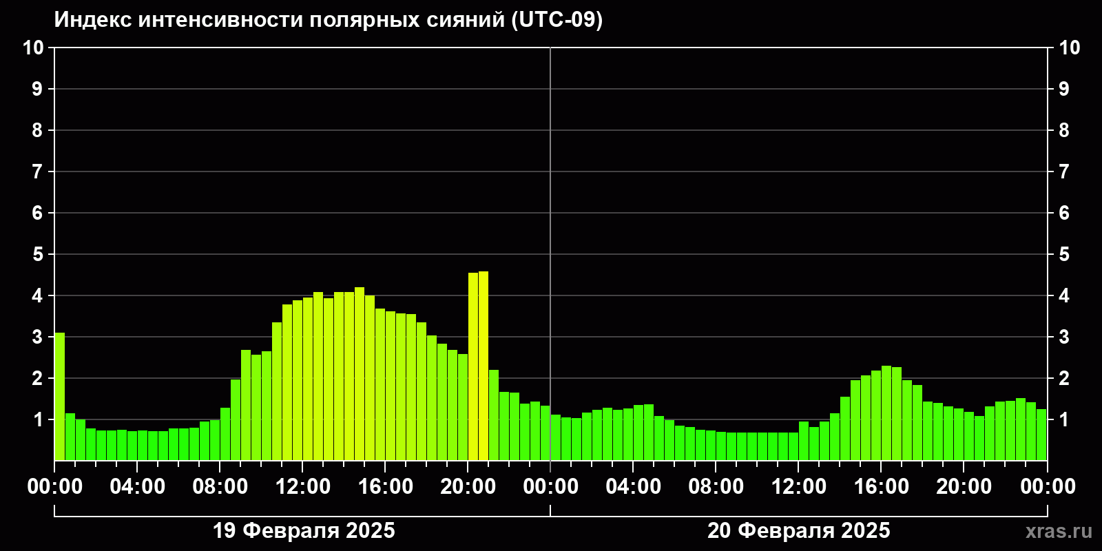 Изменения индекса интенсивности полярных сияний с 2025-02-19 по 2025-02-20 по местному времени