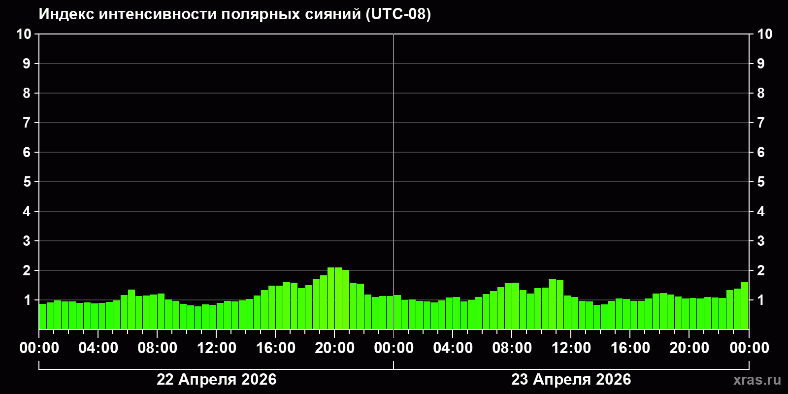 Изменения индекса интенсивности полярных сияний с 2026-04-22 по 2026-04-23 по местному времени