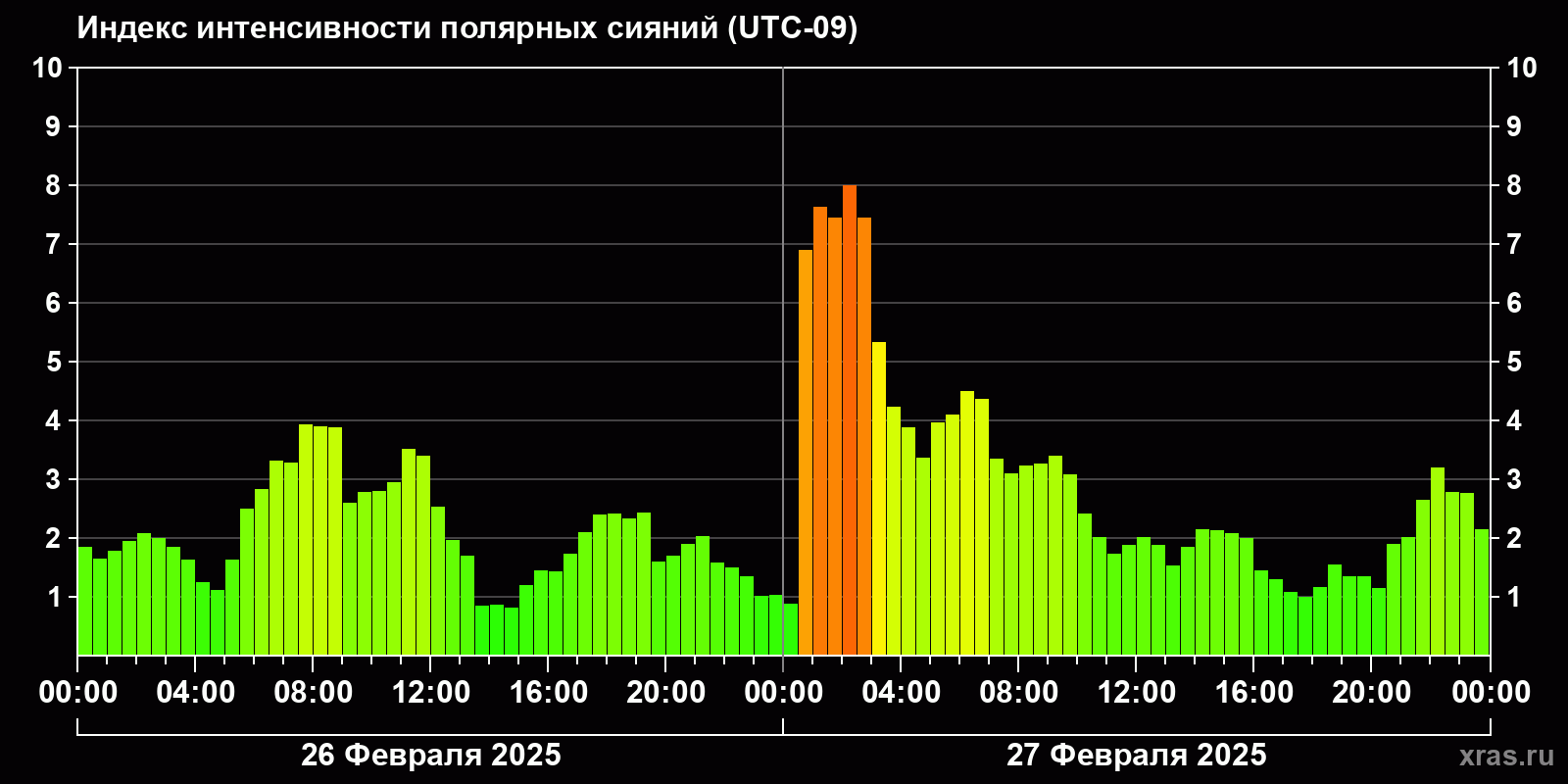 Изменения индекса интенсивности полярных сияний с 2025-02-26 по 2025-02-27 по местному времени