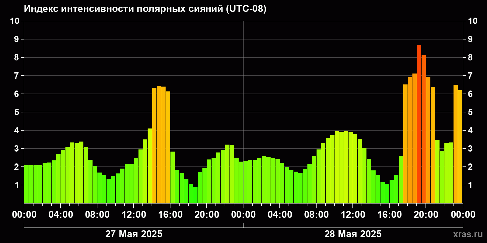Изменения индекса интенсивности полярных сияний с 2025-05-27 по 2025-05-28 по местному времени