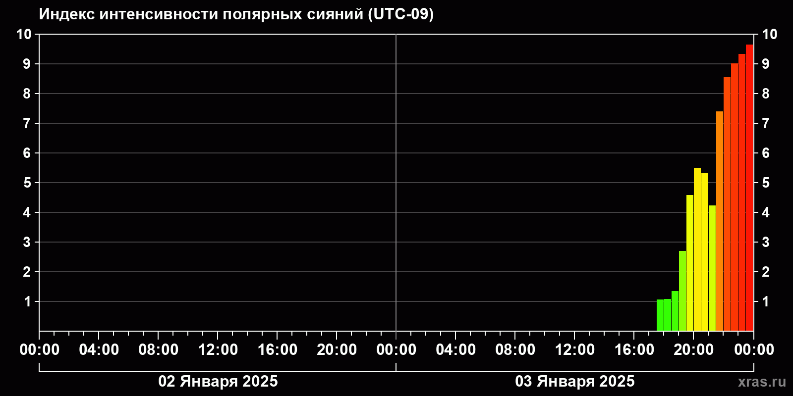 Изменения индекса интенсивности полярных сияний с 2025-01-02 по 2025-01-03 по местному времени