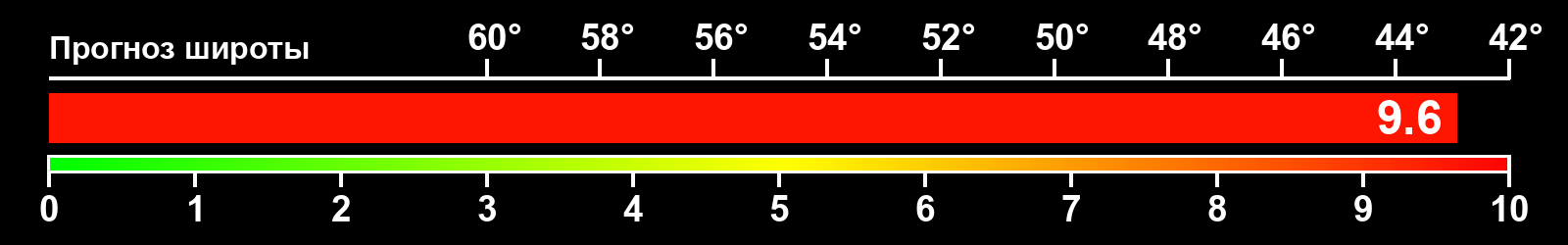 Индекс интенсивности полярных сияний и теоретически возможная широта наблюдений для ночного времени в западном полушарии по состоянию на 2025-01-03 23:46 (конец дня) по местному времени