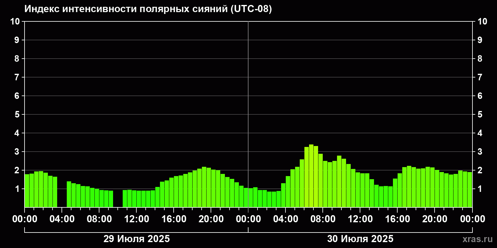 Изменения индекса интенсивности полярных сияний с 2025-07-29 по 2025-07-30 по местному времени