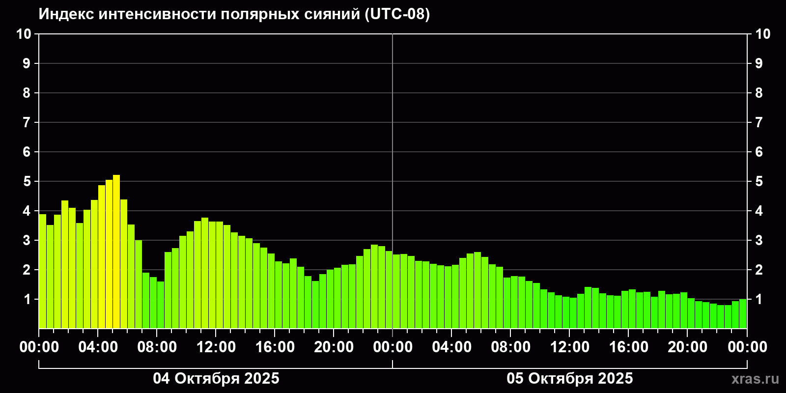 Изменения индекса интенсивности полярных сияний с 2025-10-04 по 2025-10-05 по местному времени