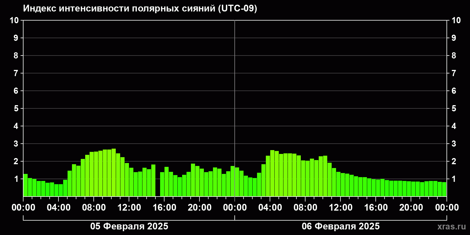 Изменения индекса интенсивности полярных сияний с 2025-02-05 по 2025-02-06 по местному времени