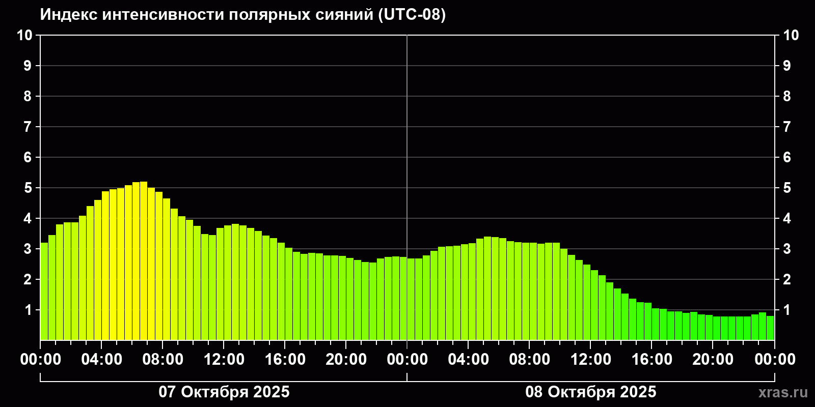 Изменения индекса интенсивности полярных сияний с 2025-10-07 по 2025-10-08 по местному времени