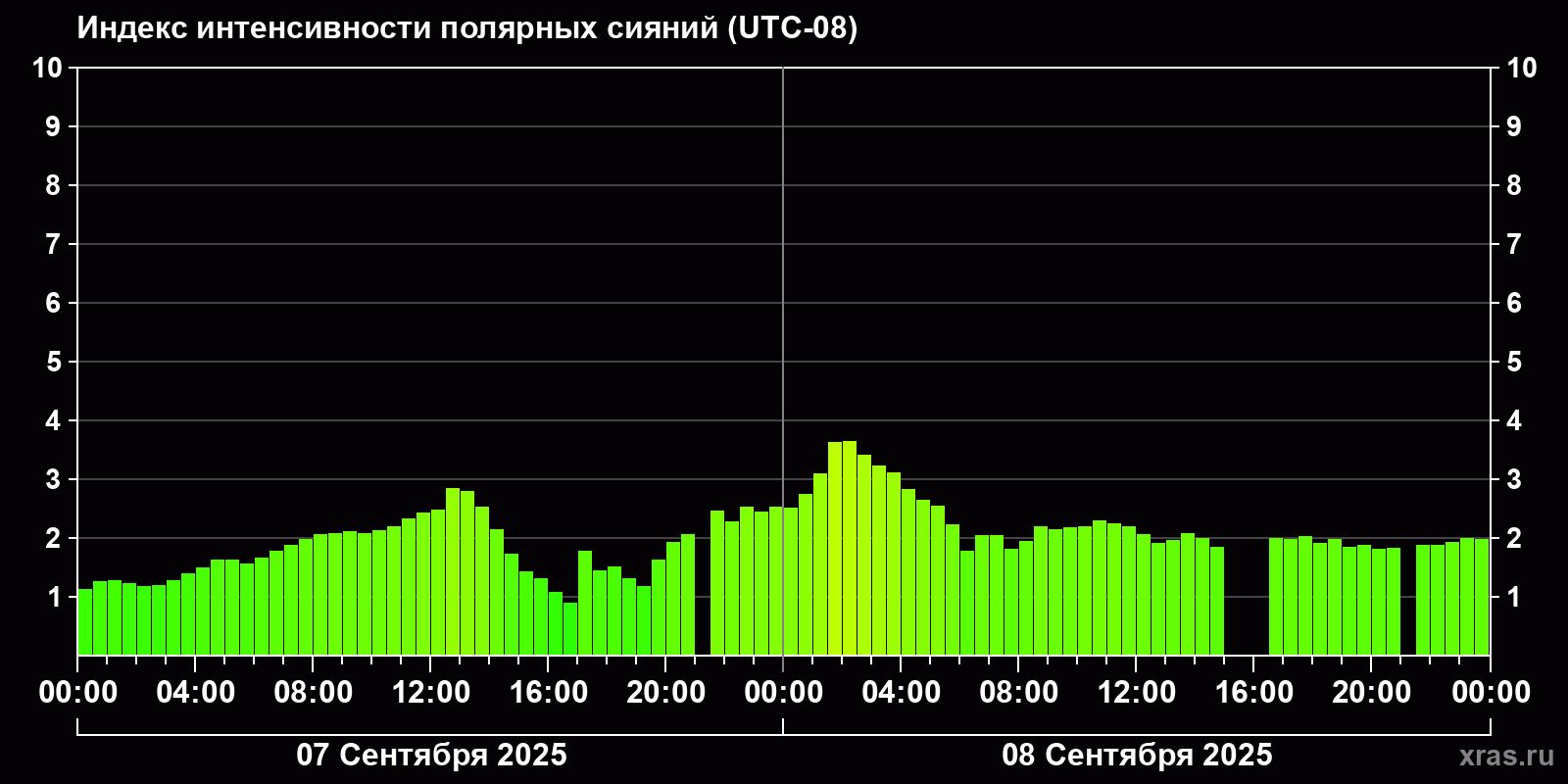 Изменения индекса интенсивности полярных сияний с 2025-09-07 по 2025-09-08 по местному времени