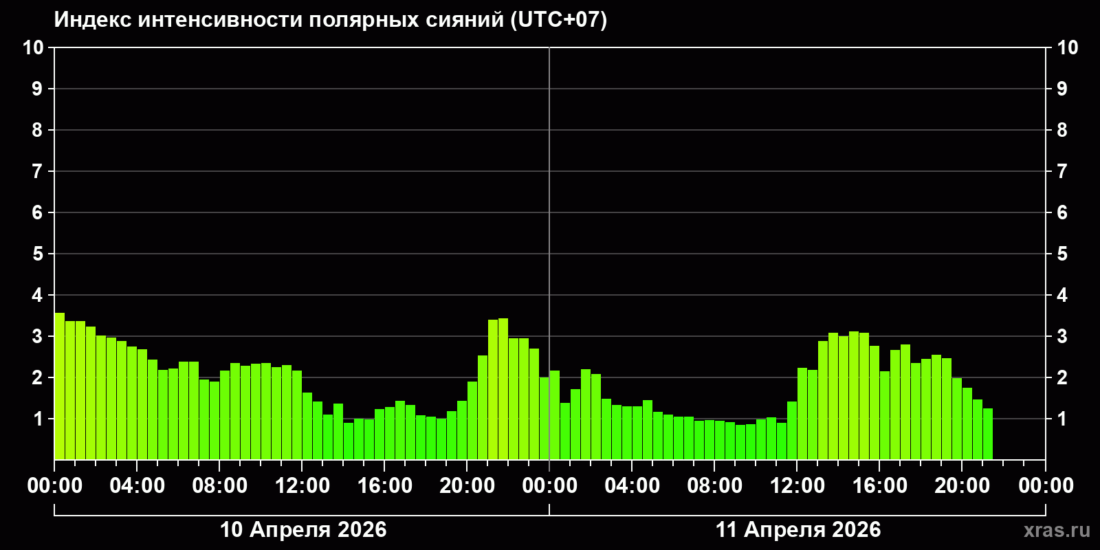 Изменения индекса интенсивности полярных сияний с 2026-04-10 по 2026-04-11 по местному времени