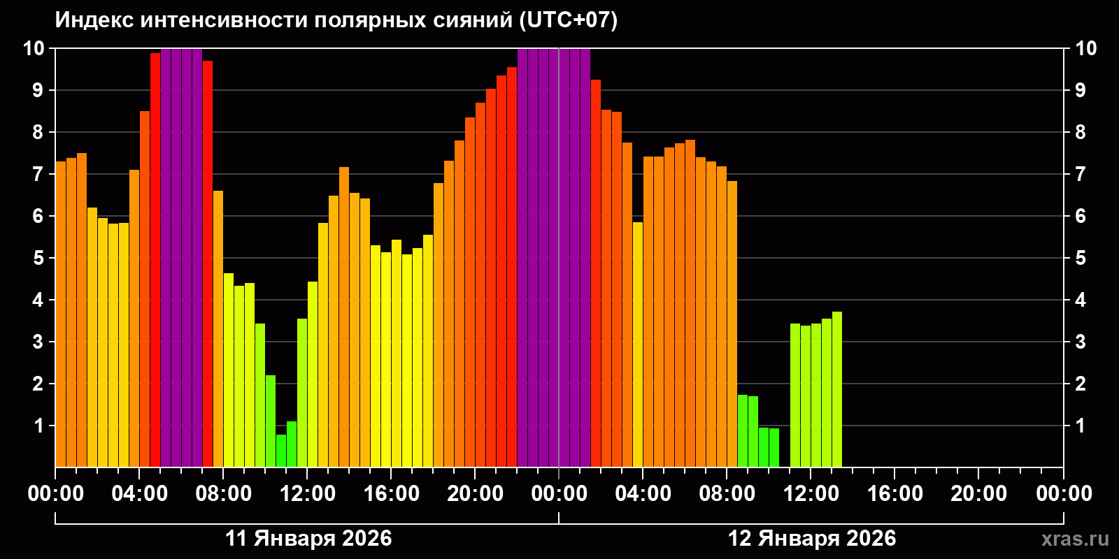 Изменения индекса интенсивности полярных сияний с 2026-01-11 по 2026-01-12 по местному времени