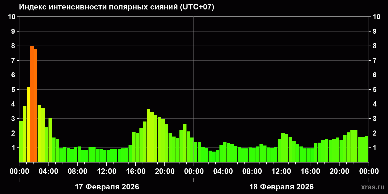 Изменения индекса интенсивности полярных сияний с 2026-02-17 по 2026-02-18 по местному времени
