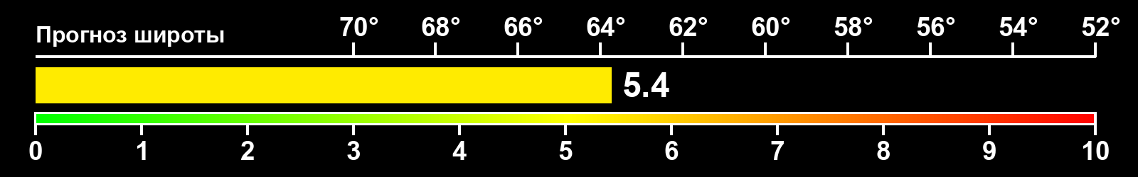 Индекс интенсивности полярных сияний и теоретически возможная широта наблюдений для ночного времени в восточном полушарии по состоянию на 2025-12-03 23:54 (конец дня) по местному времени