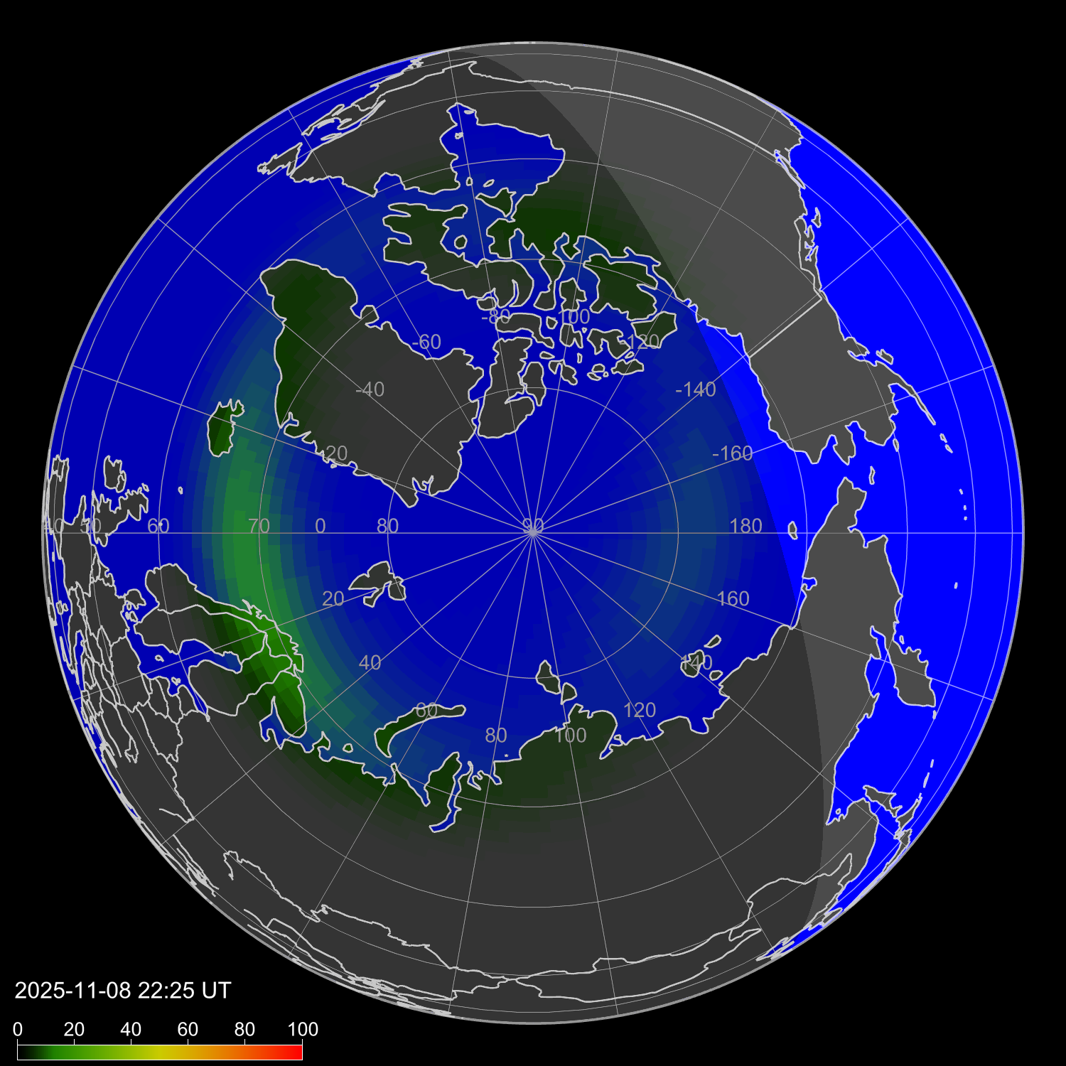 Изменения и часовой прогноз индекса интенсивности полярных сияний с 2025-11-08 по 2025-11-09
