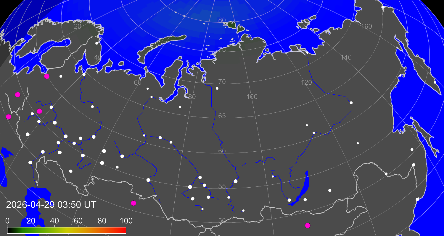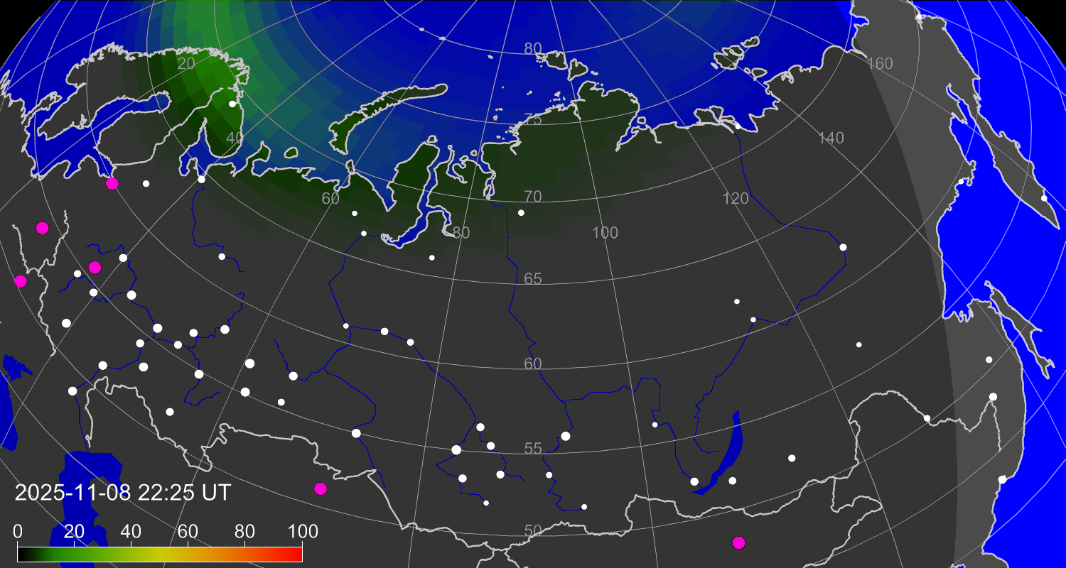 Индекс интенсивности полярных сияний и теоретически возможная широта наблюдений для ночного времени в восточном полушарии